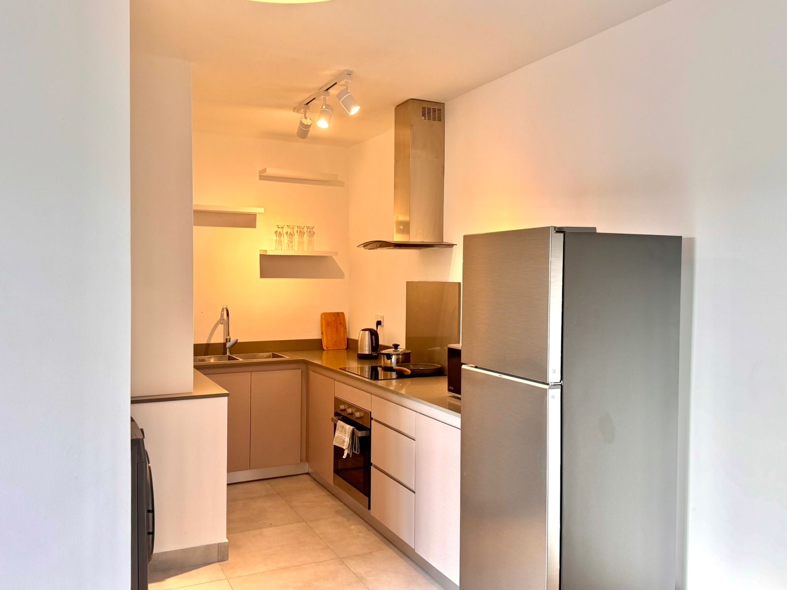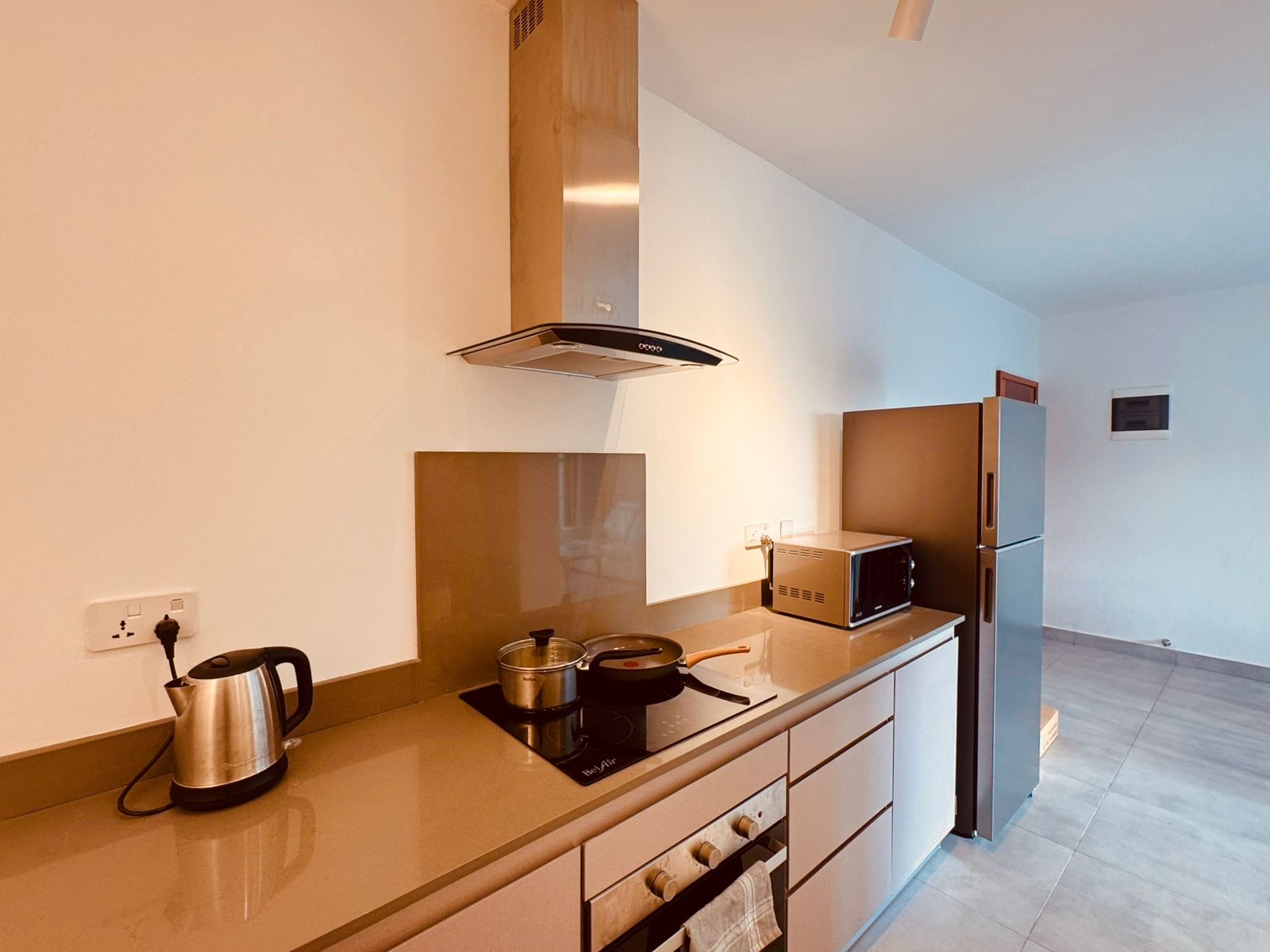 Moreover, the kitchen of this apartment for rent in Sodnac is fully equipped with high-quality appliances. This includes a refrigerator, oven, microwave, kettle, and cooking essentials. Its modern layout with ample counter space makes it ideal for everyday cooking as well as entertaining.