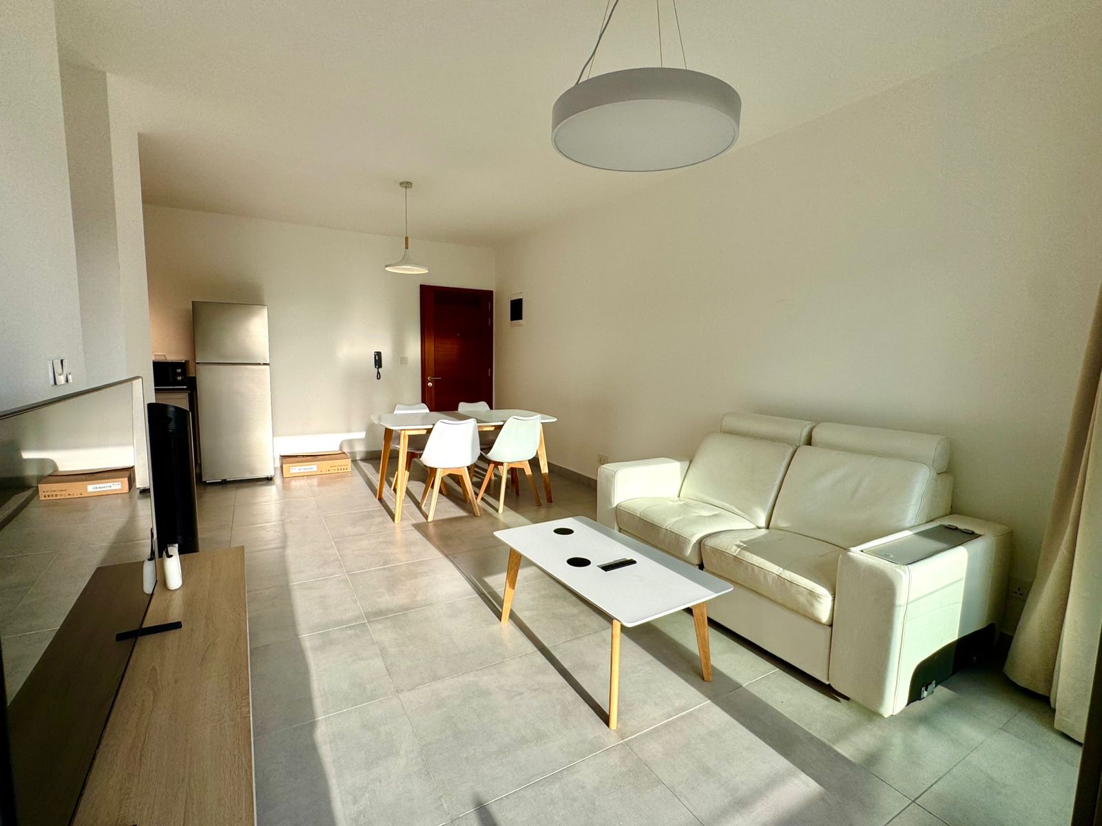 Step inside and experience a thoughtfully designed living space. It has a bright and airy open-plan layout. The living room features a sleek sofa, dining area, and direct access to natural sunlight through large windows, creating a welcoming atmosphere. The apartment comes fully furnished. All with stylish, modern furniture and neutral finishes that make it easy to personalise.