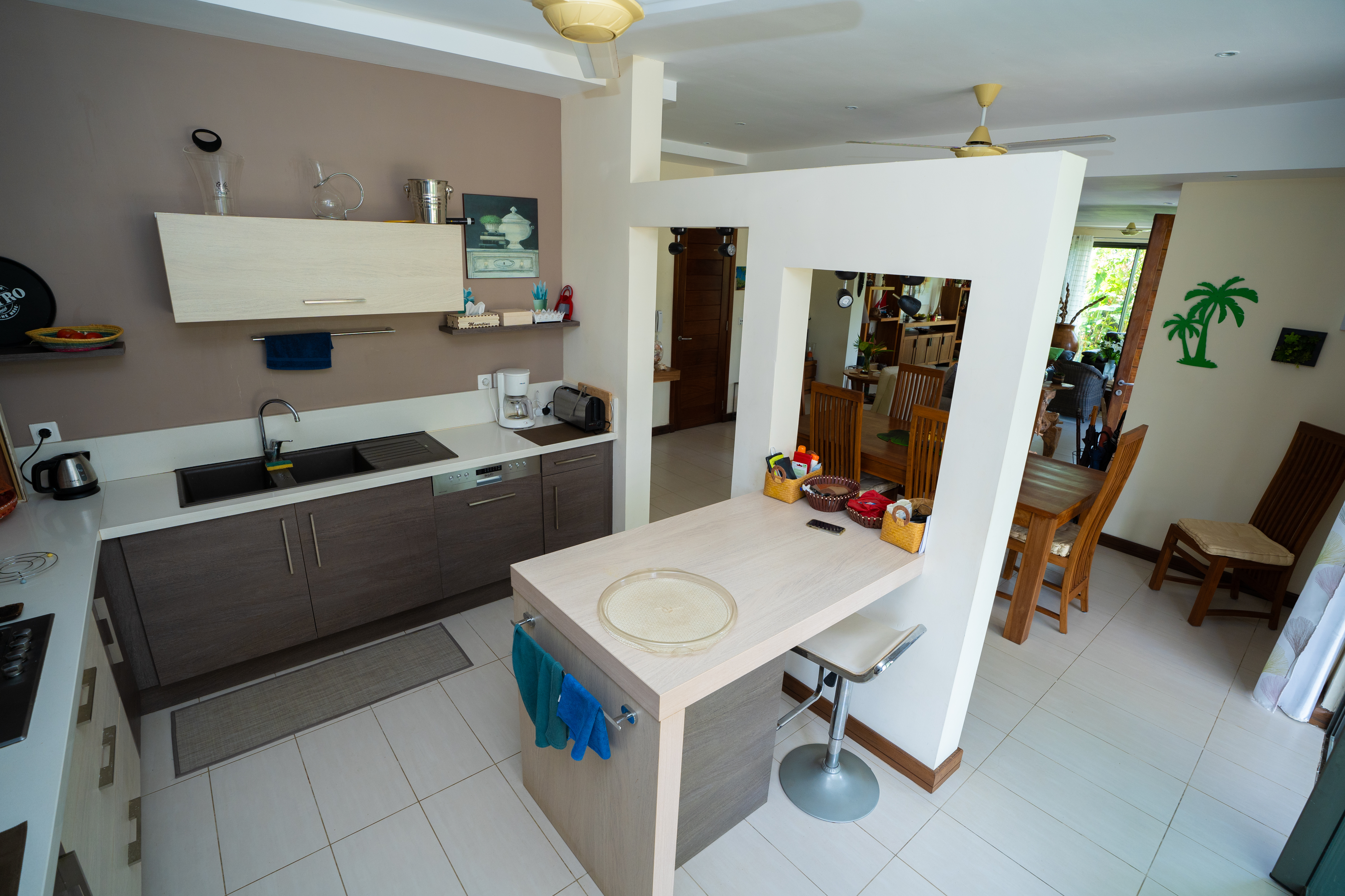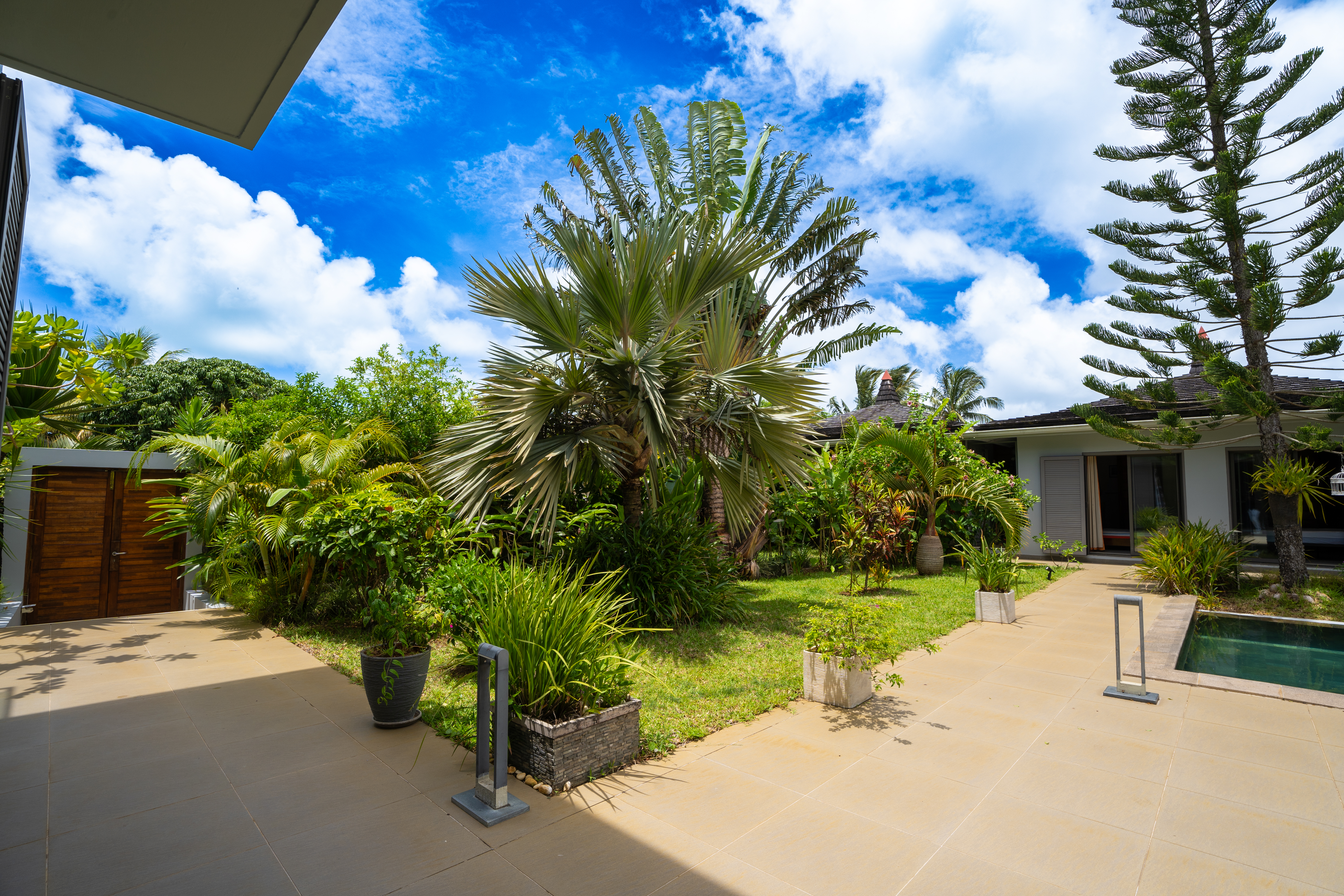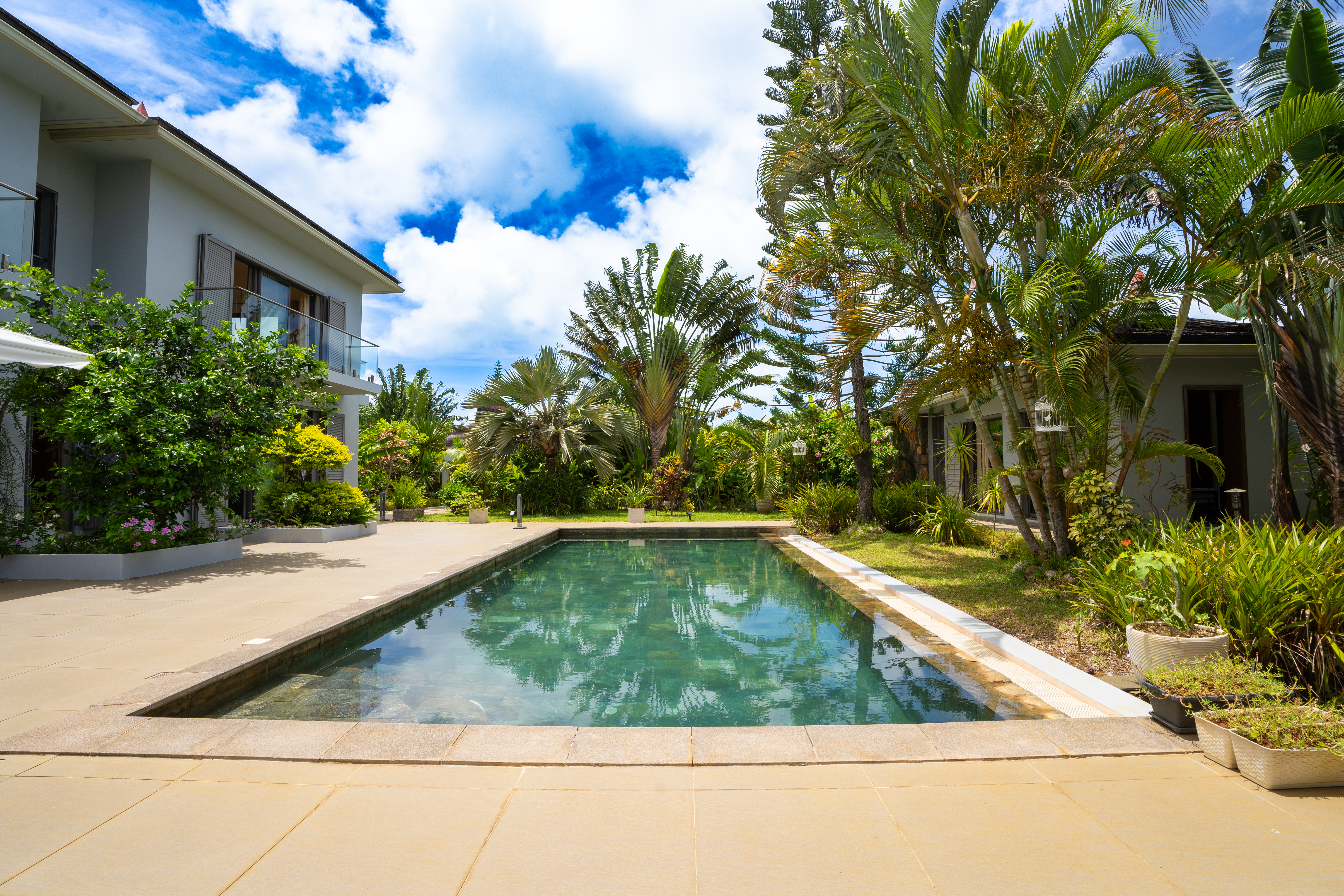 Nestled just a stone’s throw from the salty spray of the sea, this exceptional villa offers a peaceful and enchanting living environment. It is in the heart of an authentic village, notably Vieux Grand Port, where traditional charm blends with spectacular views of the surrounding mountains. From the outset, you’ll be captivated by the understated elegance of the property, harmoniously integrated into its natural setting. Indeed, thanks to its environmentally-friendly architecture and lush communal green space dotted with plants and trees.